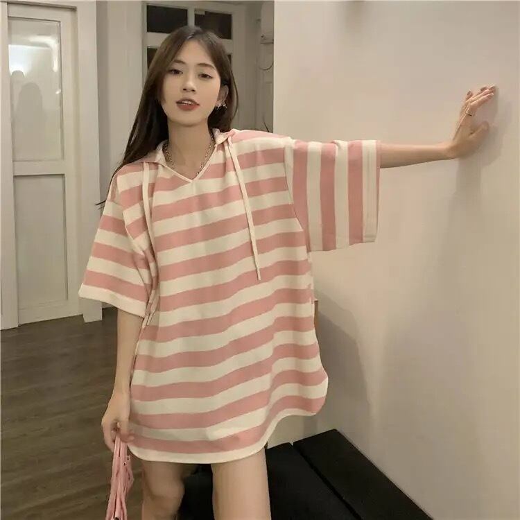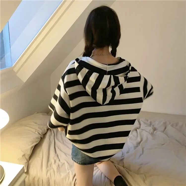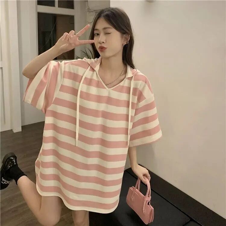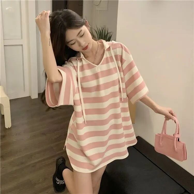ポリエステル素材でできたボーダー柄のフード付き半袖。カジュアルスタイルにぴったり